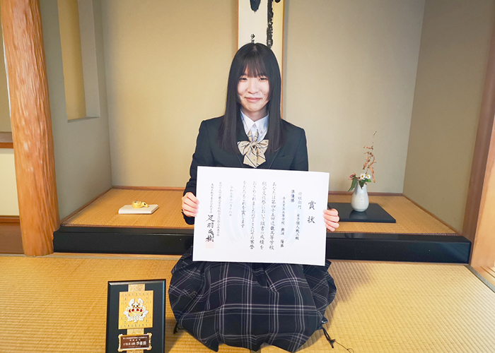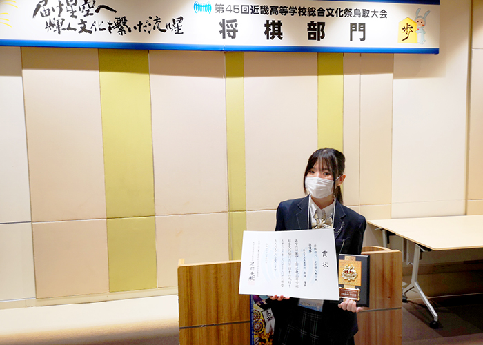 第45回近畿高等学校総合文化祭将棋部門において、私は女子個人戦A級に出場し、準優勝することができました。大会中は緊張の連続でしたが、落ち着いて丁寧に指すことを意識して対局に臨みました。いつも指導をしてくださる伊藤博文七段をはじめ、応援してくれる仲間にもよい報告ができ、嬉しかったです。